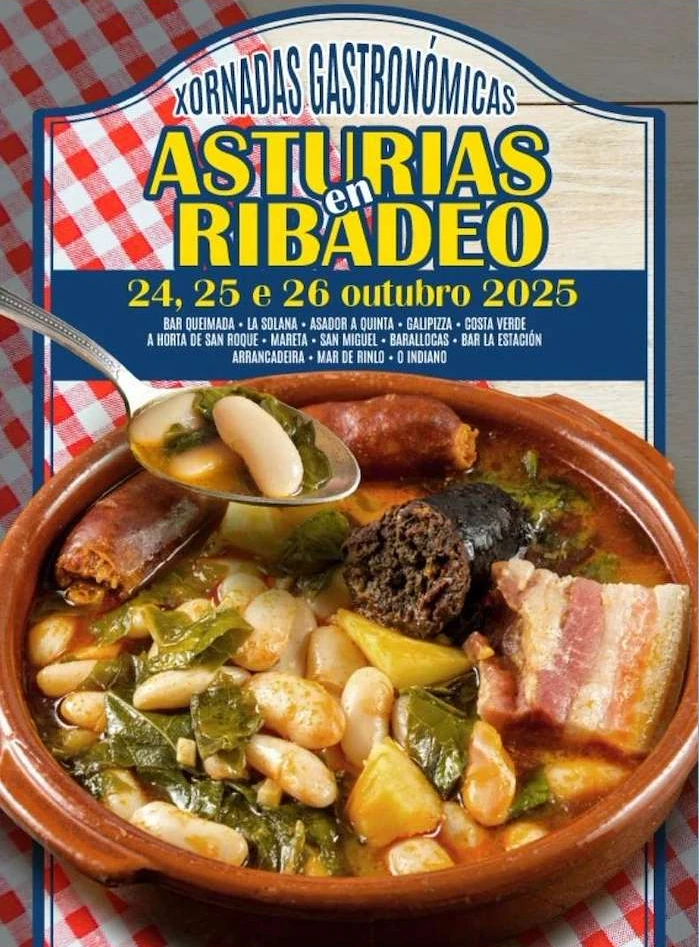 Ribadeo calienta motores antes de noviembre con una cita ya clásica: las VIII Xornadas Gastronómicas de Asturias, impulsadas por ACISA. Del 24 al 26 de octubre, más de una docena de locales sirven fabada, cachopos, pixín a la sidra, chorizos a la sidra y postres como el arroz con leche. Es un homenaje a la vecina Asturias… ¡sin cruzar el puente! Entre los establecimientos participantes figuran Bar Queimada, La Solana, Asador A Quinta, Galipizza, Costa Verde, A Horta de San Roque, Mareta, San Miguel, Barallocas, Bar La Estación, Arrancadeira, Mar de Rinlo y O Indiano.